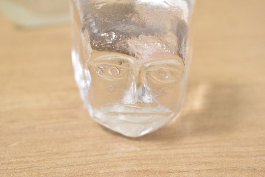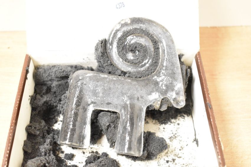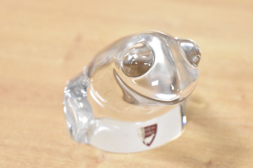 A selection of mid 20th-century Swedish glass paperweights, to include an Orrefor's frog-formed example; a small Erik Hoglund for KOSTA BODA-style clear glass face sculpture; a badger sculpture designed by Mats Jonasson for Royal Krona; and a KOSTA BODA ram figurine by Bertil Vallien as part of the 'Zoo' series; sold with a novelty Scottish Thistle example, most Swedish glass marked but not all, (5 pieces), condition is consistent with age and use.