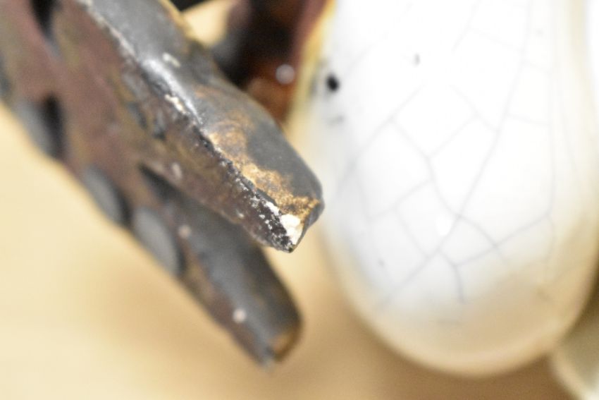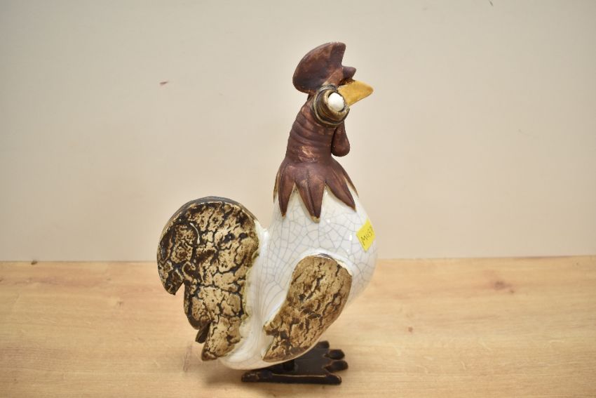 A charming contemporary studio pottery rooster sculpture, featuring a crackle-glazed finish to the plumage, wings, and tail, in a rustic brown and red colour palette, with an expressive face and stylised features, unmarked, 30cm, condition is consistent with age and use, with no large visible cracks or signs of restoration, small chip beneath one of feet.