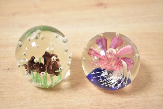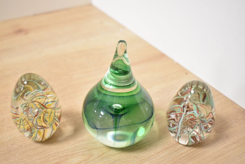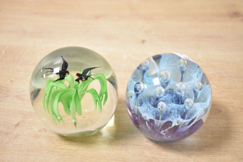 A large fine selection of mid to late 20th-century studio art glass paperweights, to include a presumed Dynasty Collection pink floral duo; one depicting two swallows in flight above a tree; two ovoid forms with internal multicoloured swirling ribbons; a deep green teardrop form; a pair with goldfish swimming above a sandy ground; and others, all unmarked, (13), condition consistent with age and use.