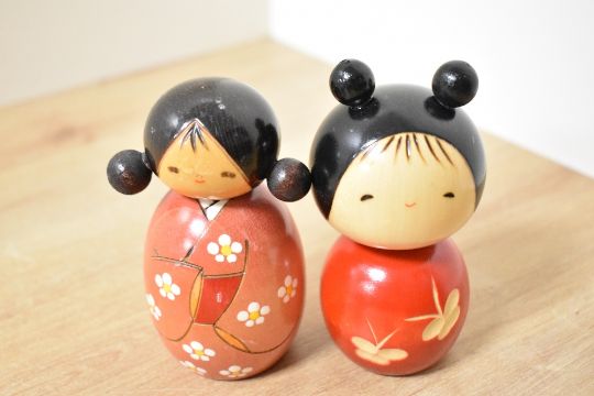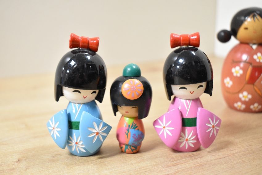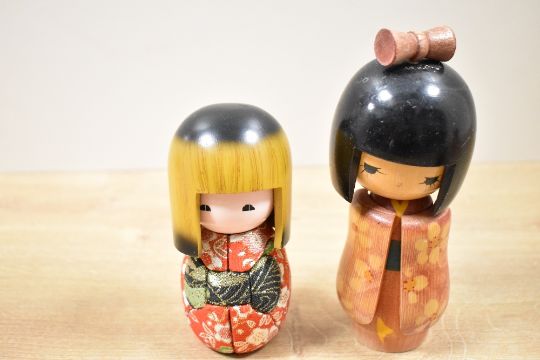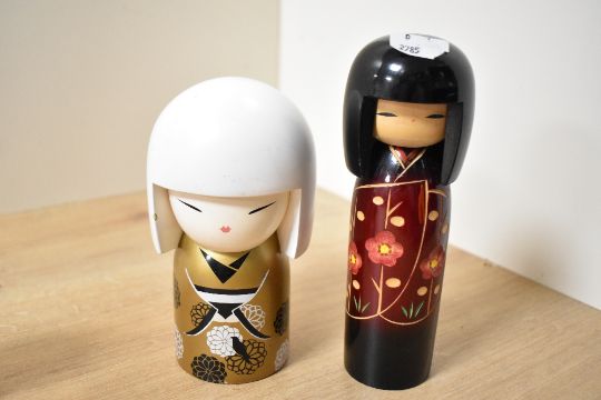 A quantity of late 20th-century wooden Japanese Kokeshi dolls, featuring hand carved floral and foliate detailing with colourful decorations, unmarked, (9), condition is consistent with age and use.