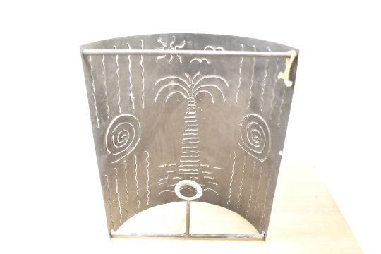 Two late 20th-century recycled metal wall lamp shades, featuring decorative palm trees and swirl-motifs, unmarked, (2), condition is consistent with age and use.