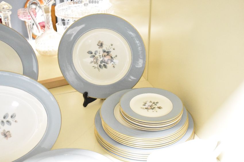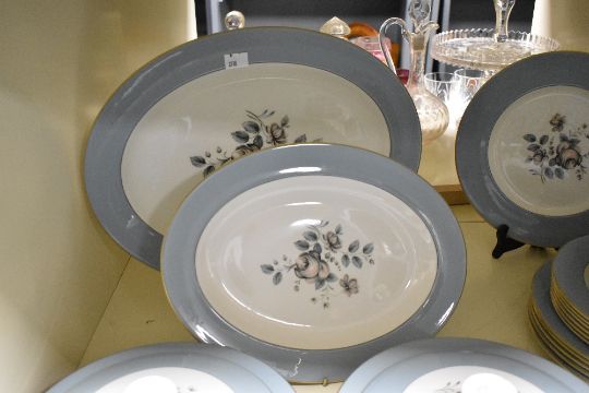 A 20th-century Royal Doulton china 'Rose Elegans' part dinner set, featuring soft blue and pink floral motifs with gilt detailing, to include two tureens with flower-formed finials, a selection of plates, a gravy bowl, and two oval serving plates, all marked to base, (approximately 25 pieces), condition is consistent with age and use, no visible chips, cracks or fixed damage.