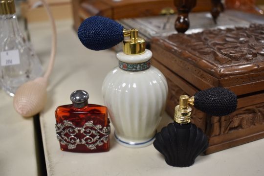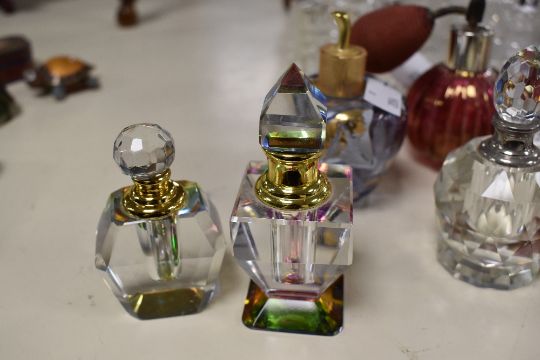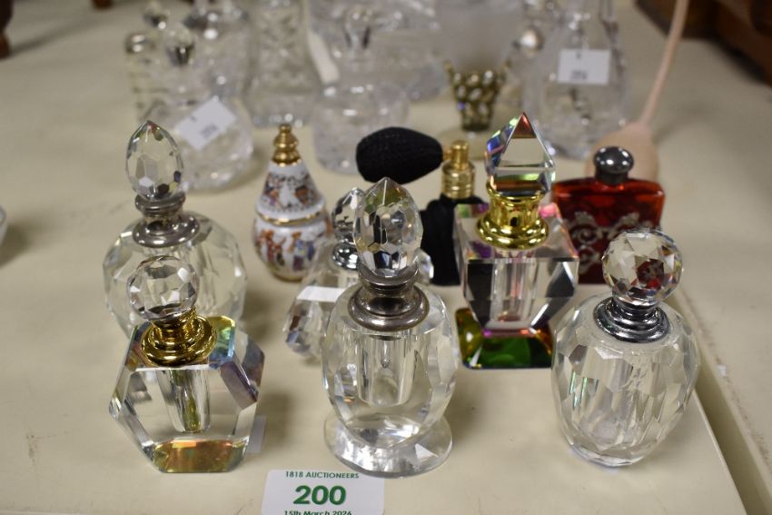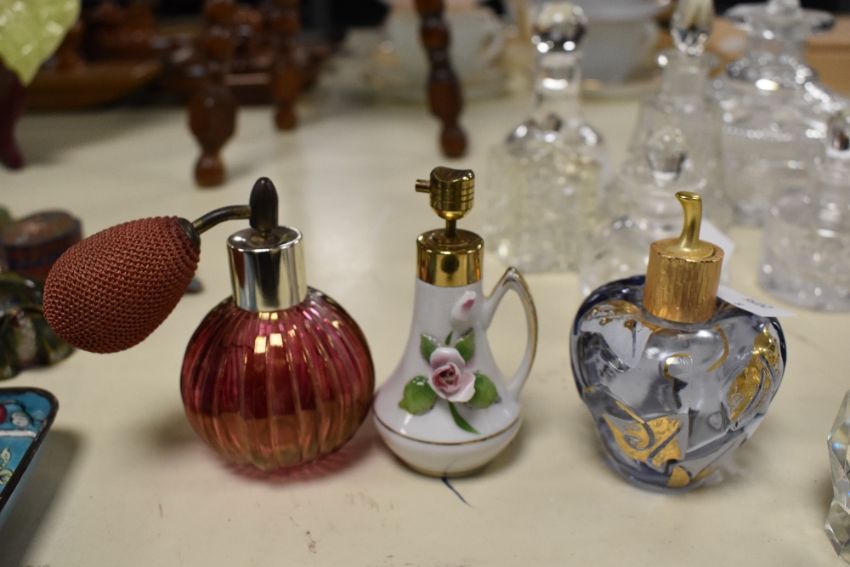 A quantity of late 19th to 20th-century glass and ceramic perfume bottles and atomisers, to feature a varied selection of Crystal cut glass examples, most unmarked, (approximately 22), condition is consistent with age and use.