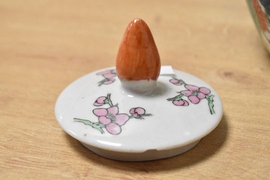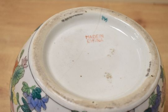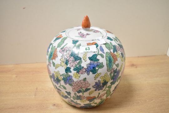 A large late 20th-century Chinese porcelain ginger jar, of orbed form, featuring colourful hand-painted floral designs and a orange finial, marked to base, 24cm, condition is consistent with age and use, a few hairline cracks, small chip to rim of lid and some areas of surface wear.