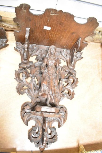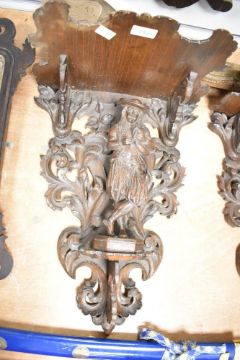 A fine pair of 18th-century/19th century Flemish-style carved wooden wall brackets, featuring elaborate foliate decorations adorned with a female and male figure, the male plays a pipe whilst the female dances, unmarked with wall hanging fixtures to reverse, both approximately 46cm, condition is consistent with age and use, visible areas of wear to wood, areas of dust, minor evidence of old/dead wood worm to male example, some areas of small chips or cracks to wood, male example is slightly loose from his pedestal.