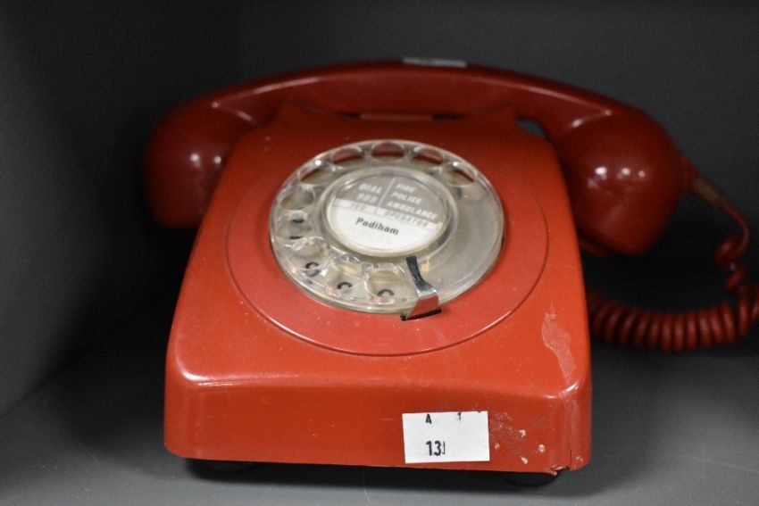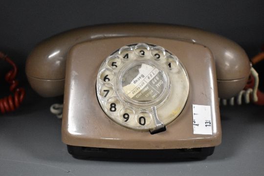 Three mid to late 20th-century rotary dial landline telephones, to include two red and one beige example, (3), condition is consistent with age and use, sold as seen.