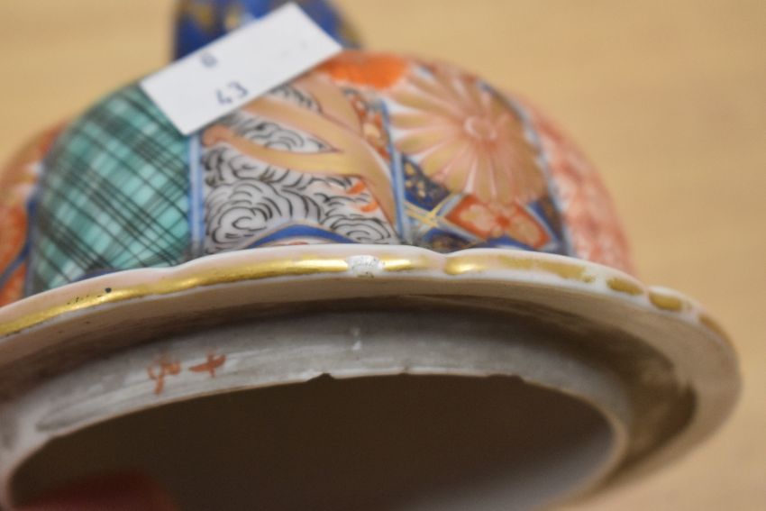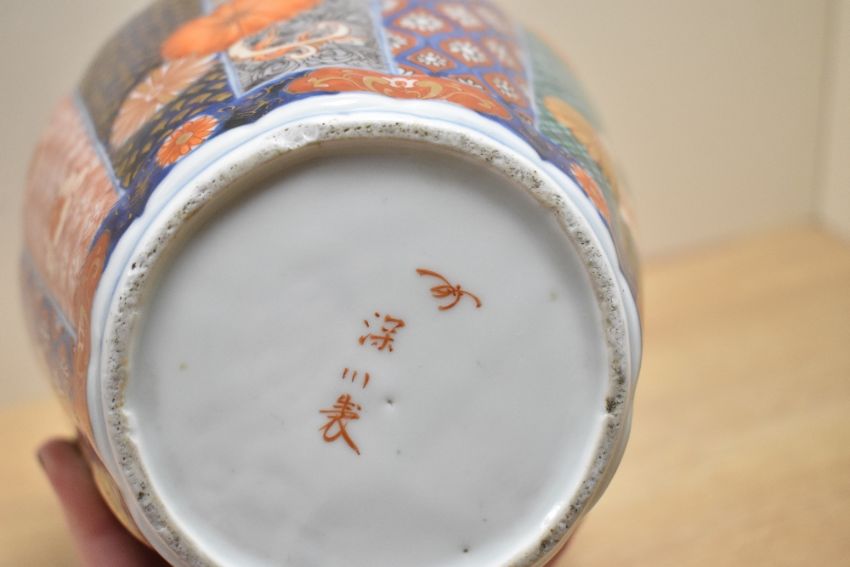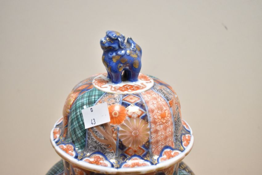 A fine presumed Meiji-period Japanese Fukagawa Koransha Imari porcelain vase, having a deep blue foo-dog finial, a ribbed body with raised flower heads, and hand-painted interchanging vertical panels of dragons, mon, and simulated brocade, with gilded detailing, marked to base, approximately 36cm, condition consistent with age and use, with some small chips to the inside of the lid, but no evident damage, chips, or cracks to the exterior.