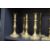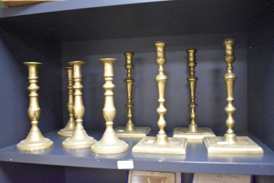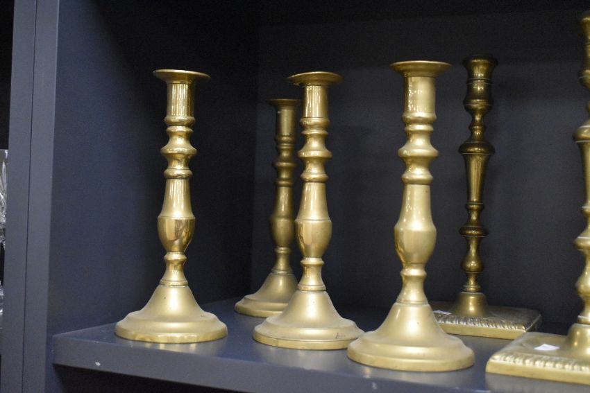 Two sets of four 19th-century brass candlesticks, each with baluster stems, one set with circular bases and the other with ornate square bases, all unmarked, (8), condition consistent with age and use.