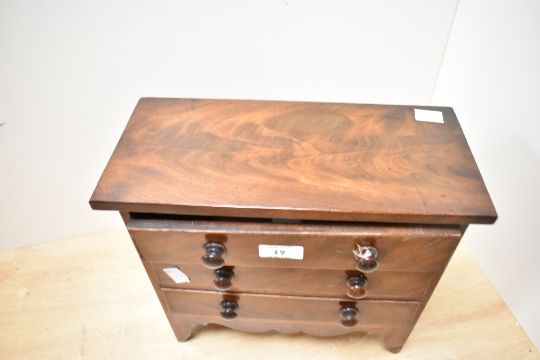 A 19th-century mahogany miniature chest of tabletop drawers, presumed apprentice piece, featuring three drawers and a decoratively shaped apron, unmarked, 28cm tall, condition consistent with age and use, visible areas of surface wear, small fixed damage to the front right leg, drawers fitting snugly but not sitting flush.