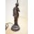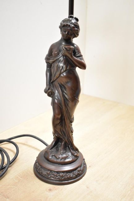 A 20th-century Art Nouveau-style copper-coloured spelter table lamp, having a frosted glass tulip-shaped shade, featuring a quantity of leaves under which a female figure swathed in fabrics stands upon a floral decorated base, unmarked, 55cm, condition is consistent with age and use, sold as seen.