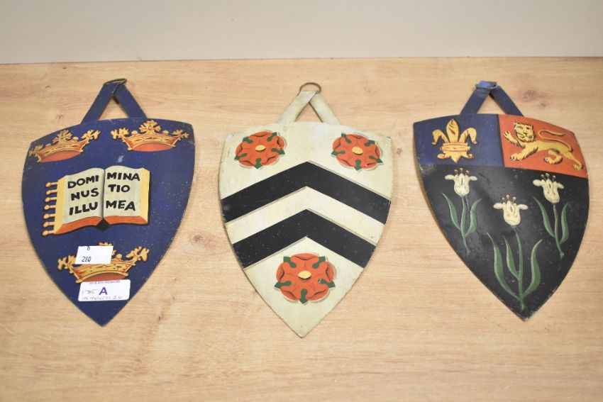 Three early 20th-century metal heraldic shields, to feature the hand painted coat of arms of Eton College; the University of Oxford; and of William of Wykeham, associated with New College Oxford, unmarked but with wall hangings atop, (3), condition is consistent with age and use, visible areas of surface wear and slight dullness to paint.
