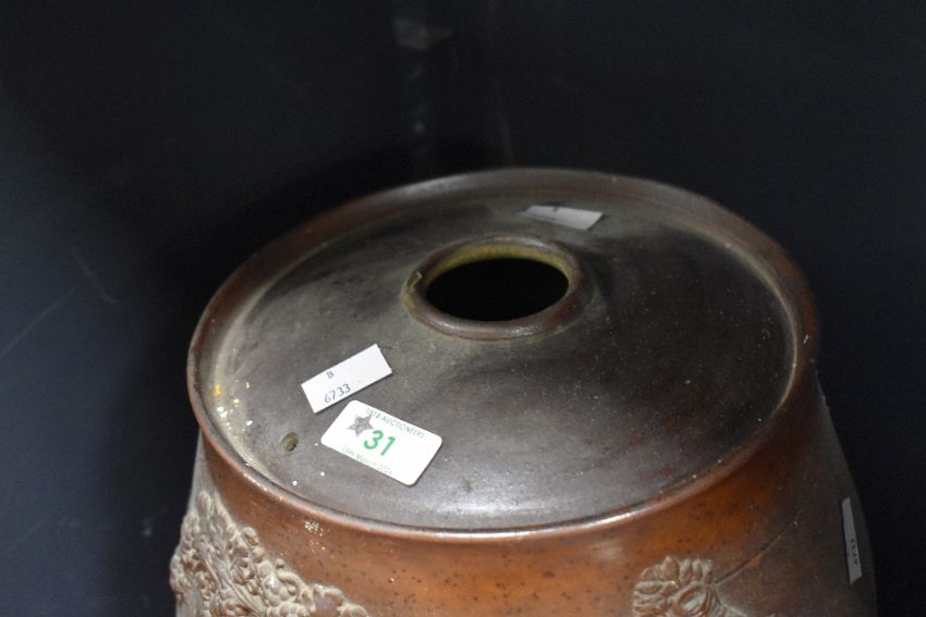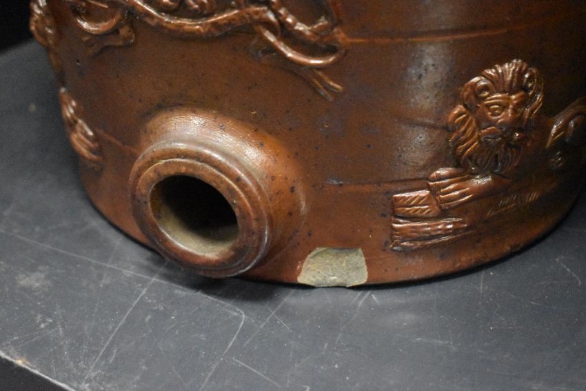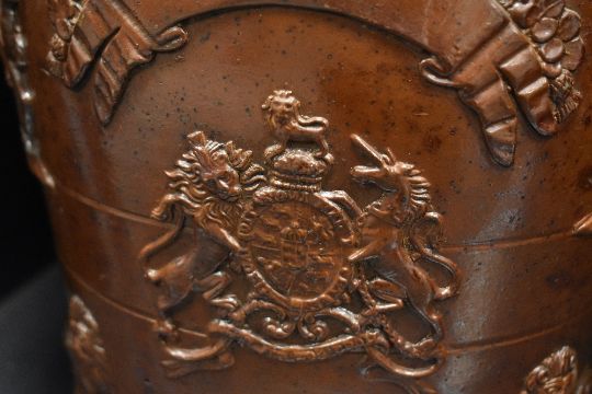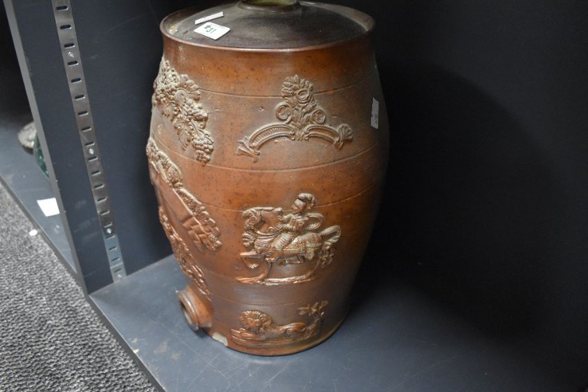 A Victorian salt-glazed stoneware spirit barrel, of traditional form, moulded in relief with the arms of the United Kingdom, with vacant banner above and enclosed by Knights and Lions, lacking spigot and cover/seal 37cm chips to base