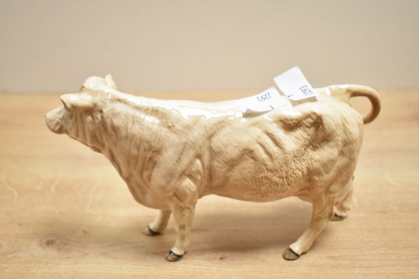 A 20th-century Beswick pottery Charolais Cow figurine, model 3075A, with a light brown glossy finish, marked to base and hoof, 19cm, condition is consistent with age and use with small chip to right ear.