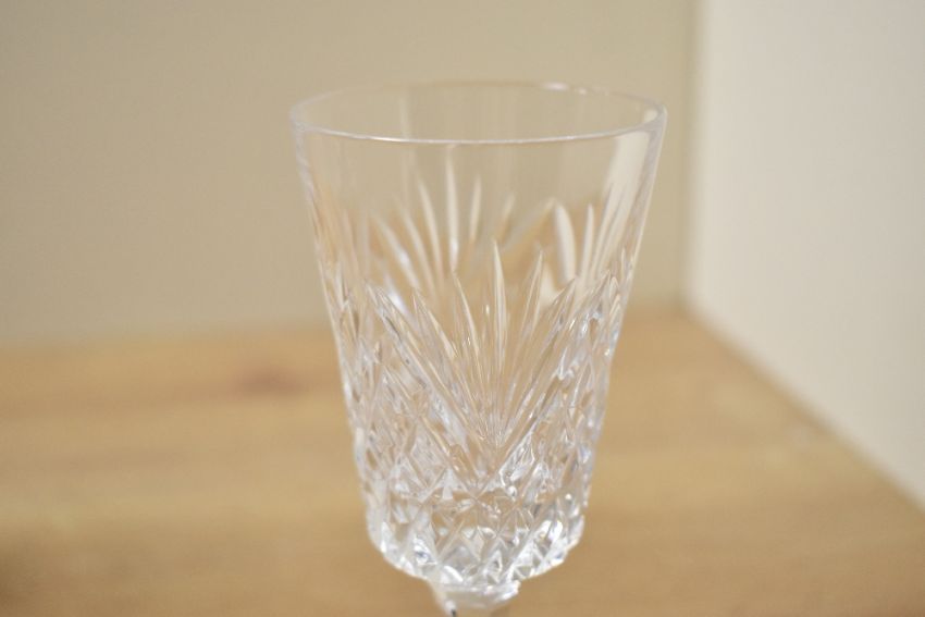 Six 20th-century Irish Tyrone Crafted Glass 'Antrim' wine glasses, featuring deep diamond and vertical wedge cuts to the bowl and a starburst pattern to the base, all etched to base, all 15cm tall, condition consistent with age and use, no visible chips, cracks or restoration.