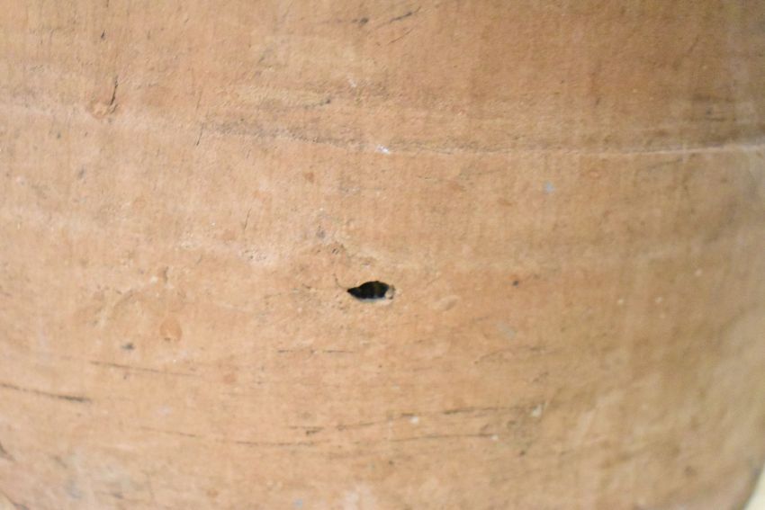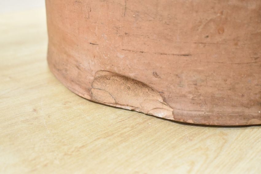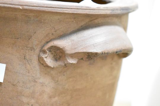A large early 20th-century studio pottery pot, of cylindrical form with small lug handles, unmarked, 31cm, condition is consistent with age and use, large chip to base rim visible.
