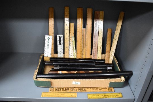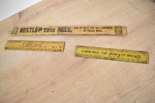 A large selection of 20th-century wooden rulers and advertising yardsticks, to include a variety of advertising and novelty examples, including Nestlé, Jacob and Company Biscuits, Helix, and Eagle Pencil Company of New York, most marked but not all, (1 boxful), condition is consistent with age and use, with visible wear to the wood and fading to some numbers and measurements.