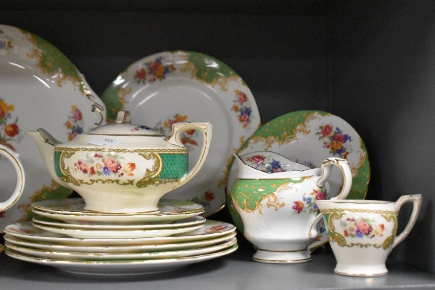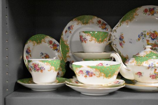 A quantity of 20th-century Paragon bone china 'Rockingham' tableware, featuring delicate Oriental bird of paradise motifs surrounded by vibrant floral and foliate panels with intricate gilded scrollwork, to feature cups, saucers, a teapot, a small serving tray, side plates and more; sold with a Myott and Son of Staffordshire 'The Bouquet' teapot and milk creamer, all marked to base, (2 pieces of Myott and Son and approximately 25 pieces of the Paragon), condition is consistent with age and wear, one plate from 'Rockingham' tableware has been stapled back together, visible areas of surface wear and slight gilt wear to.