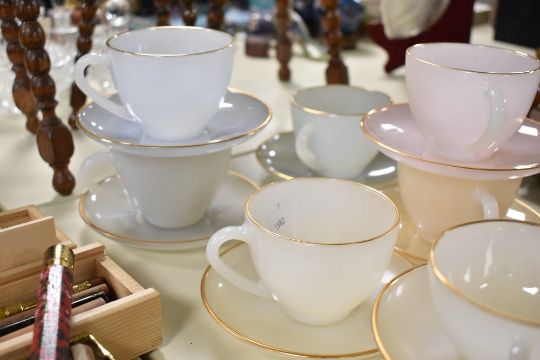 A quantity of vintage Arcopal France translucent glass cups and saucers, of soft pastel pinks, greens, yellows and blues with gilt rim detailing, all marked to base, (24 pieces), condition is consistent with age and use, no visible chips, cracks or fixed damage.