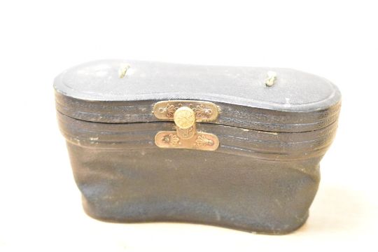 A pair of small 19th-century black metal opera glasses, having original black leather case, markings are illegible due to fading, (1 pair of glasses with 1 case), condition is consistent with age and use, no longer having leather handle to case, past evidence of repair to frame of glasses.