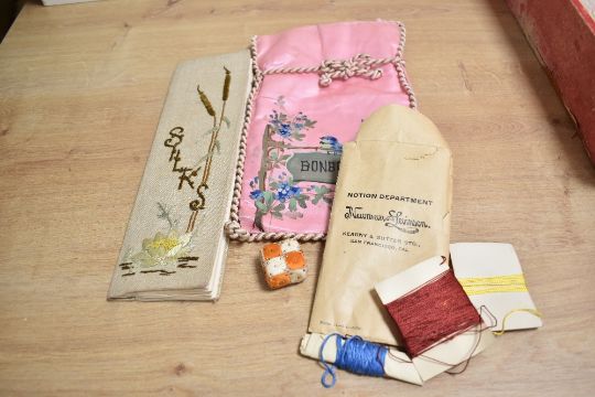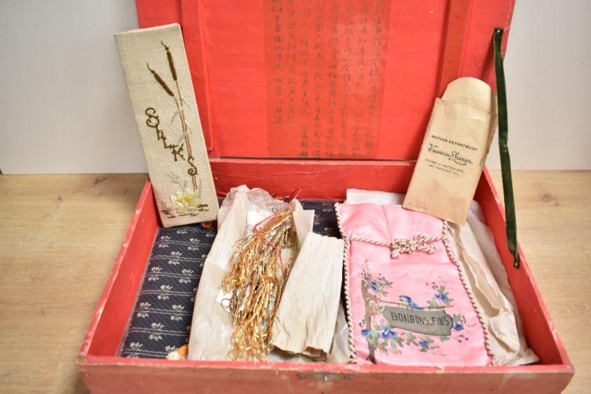 Thought to be a 19th-century Chinese-style decorative wooden box, featuring intricate and colourful traditional-style figural and floral detailing; sold with contents including a small embroidered “Silks” paper pad; a silk-style drawstring sweets or chocolate pouch reading “Bonbons Fins,” decorated with a hand-painted bird and floral motif; and a small selection of sewing notions, mostly unmarked, (1 box and contents), condition is consistent with age and use, with visible exterior wear to the box and hand-painted decoration; all sold as seen.