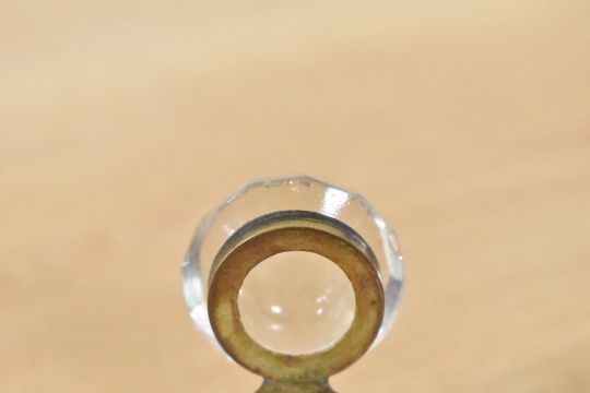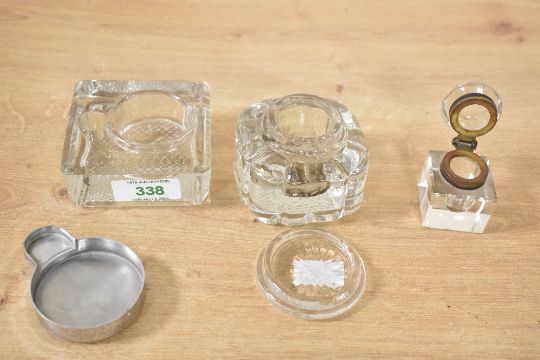 Three late 19th to early 20th-century glass inkwells, to feature a small cut glass crystal example with a hinged brass collar lid; a 'Victor' Numan-style metal lid example and a moulded octagonal example, all unmarked, (3), condition is consistent with age and use, a few chips to areas of glass, most noticeable around rims.