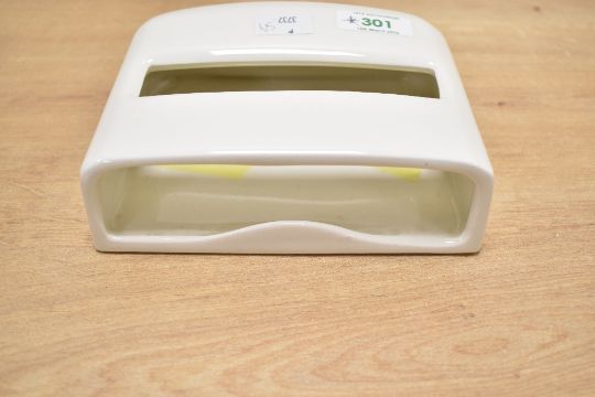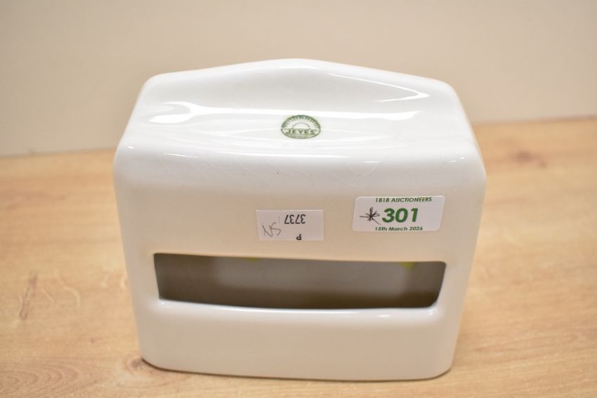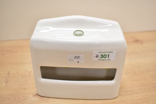 A vintage Jeyes ceramic toilet paper holder, wall mounted and designed to accomodate flat-pack Jeyes tissue refills, marked to topside, 15cm, condition is consistent with age and use, no visible chips or cracks.