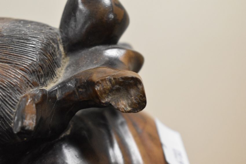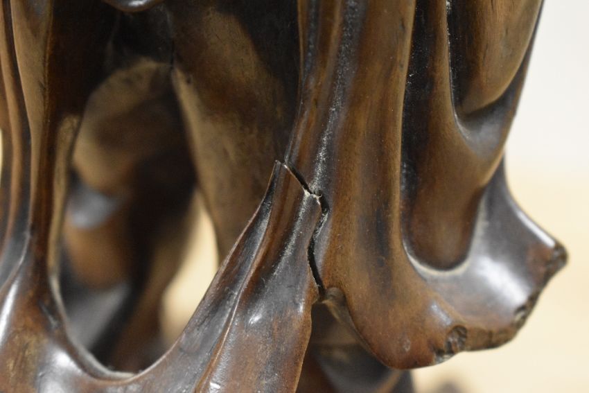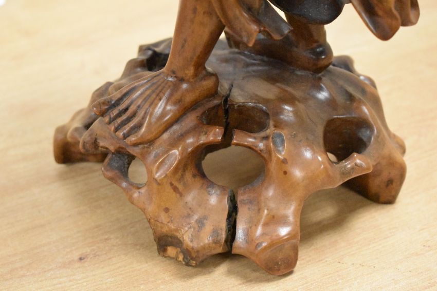 A large 20th-century Chinese hardwood figure of an Immortal, featuring a bearded, elderly man in traditional dress holding a sack of peaches in his left hand and a sprig of peaches slung over his right shoulder, atop a carved base, unmarked, approximately 38cm, condition is consistent with age and use.