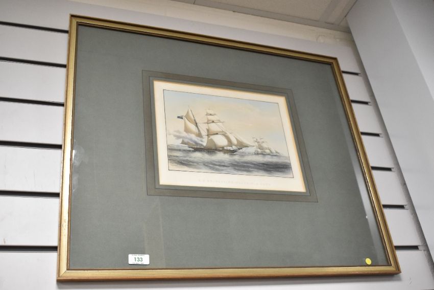 A large framed late 19th-century maritime print, titled 'H.M Brigantine Dolphin, 3 Guns' after H. John Vernon, launched in 1836 HMS Dolphin was a 3-gun packet brigantine ship of the Royal Navy, participating in the Battle of Vuelta de Obligado, decommissioned in 1861 and sold in 1894, print marked to corner, approximately 58cm x 70cm gilt frame, condition is consistent with age and use.