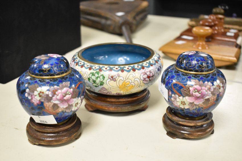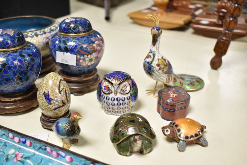 A quantity of 20th-century Japanese cloisonne ware, to include a small pair of ginger jars with pink floral decoration on a cobalt blue ground; two small turtles with removable shells revealing trinket compartments; a miniature duck-form bird; a charming peacock; and other similar pieces; sold together with a set of presumed late 19th-century Chinese Canton enamelware-style tray and jewellery box, featuring a turquoise ground decorated with pink flowers, scrolling foliage, and bird motifs, most pieces unmarked, (13 pieces total), condition consistent with age and use.