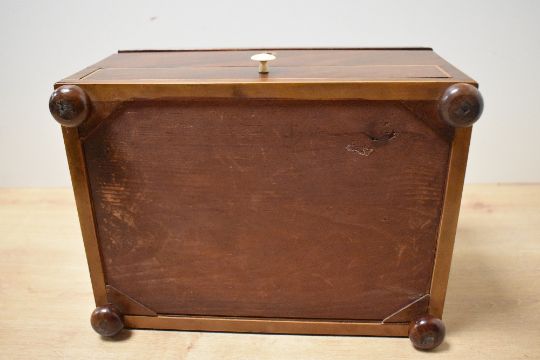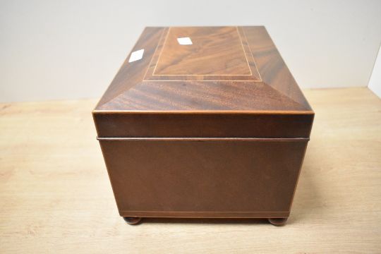 A fine 19th-century mahogany jewellery box of soft sarcophagus-form, featuring fine boxwood inlay and a diamond-shaped escutcheon, the interior fitted with small drawers and a lower drawer with a concealed opening, raised on four ball feet, unmarked, 28cm in length and 17.5cm in height, condition consistent with age and use, no key.