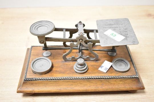 A fine 19th-century W. Leuchars of Piccadilly metal and wood postal letter scales, featuring a set of graduated weights with one side of the balance impressed with the 'Rates of Postage', upon a mounted stand with rope detailing, marked to scale, 23cm x 13cm, condition is consistent with age and use.