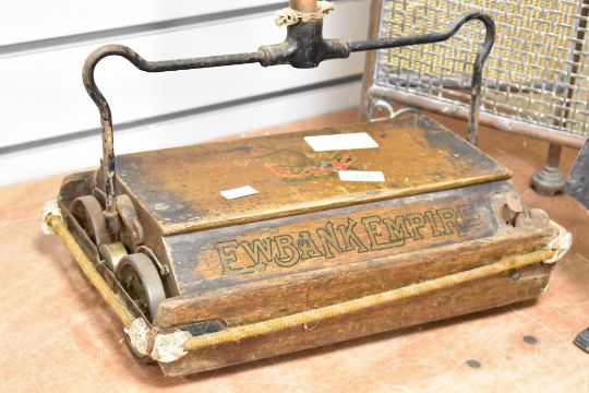 A quantity of early 20th-century household wares, to feature a Ewbank Empire carpet sweeper, featuring a steel handle, oak body and painted logo; a wrought iron fire tool set, with an ornate fleur-de-lis finial atop the stand; and a metal three-panelled mesh fire screen, carpet sweeper marked but others are not, (3), condition is consistent with age and use, visible areas of wear to all, sold as seen.