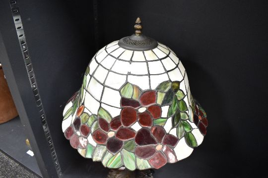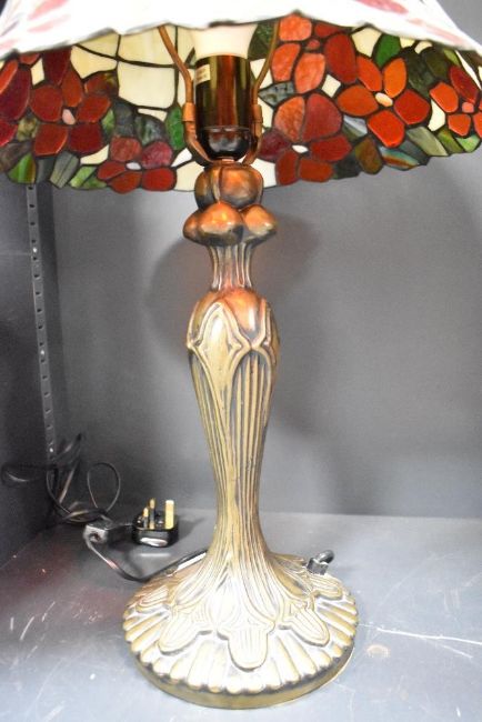 A 20th-century Tiffany-style table lamp, featuring a hand crafted stained glass shade with red and green floral motifs and a decorative bronze-finish Art Nouveau-style base, unmarked, approximately 63cm tall, condition is consistent with age and use, no visible chips, cracks or fixed damage, PAT tested, sold as seen.