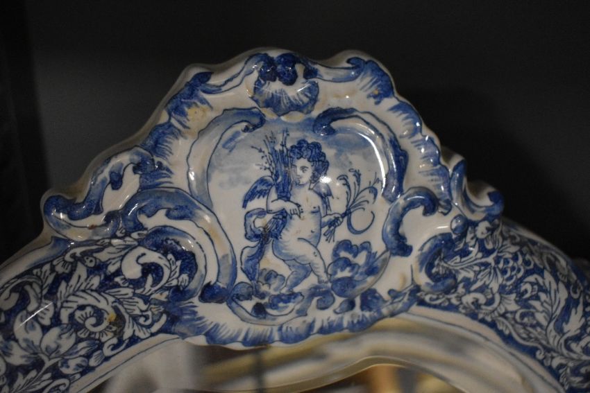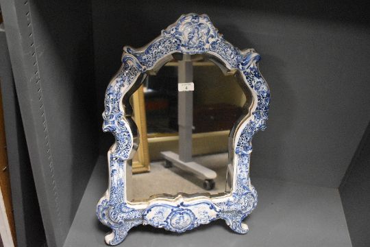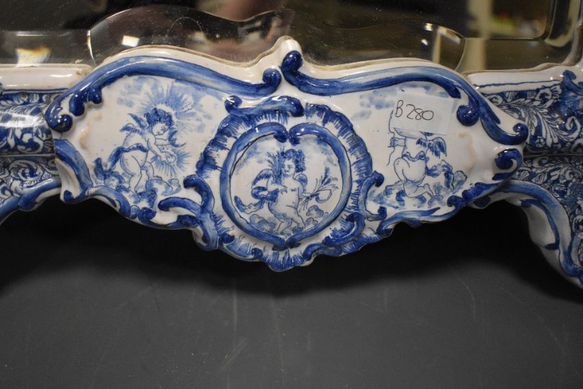 A 19th-century Dutch Delft framed mercury silver cut mirror, of ornate scrolled form, featuring hand-painted blue and white decoration floral and foliate detailing with sweet interspersed Putti detailing, having a wooden backboard and stand, unmarked, 63cm, condition is consistent with age and use, some visible areas of dust from storage, small chip to left section of mirror.