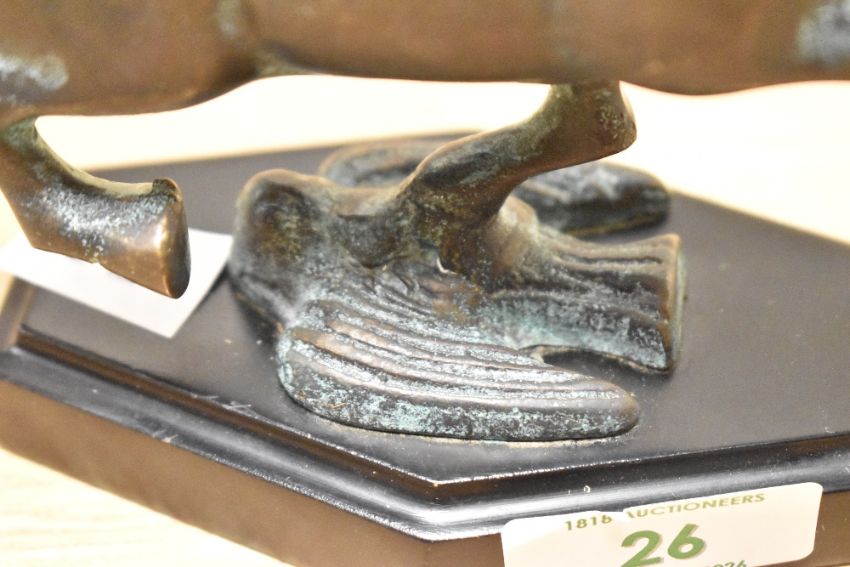 An early 20th-century bronze Flying Horse of Gansu-style statue, upon a metal base, unmarked, 15.5cm from base to tallest point, condition is consistent with age and use.