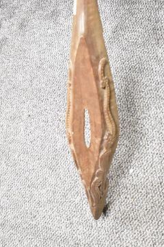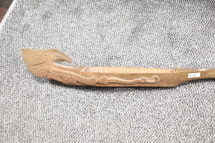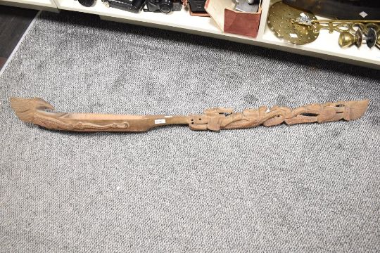 Tought to be 20th-century Hawaiian tribal 'tiki' hard wood totem, featuring a selection of folk art-style figural and zoomorphic bird-like motifs with a large whittled dip to one end, unmarked, 128cm, condition is consistent with age and use.