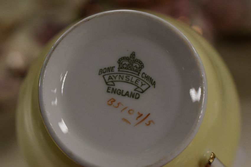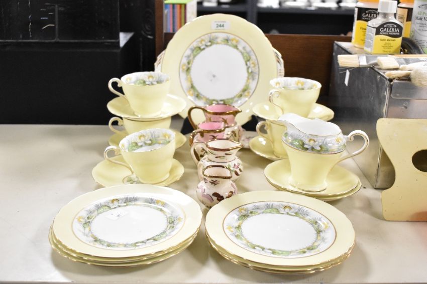 A selection of 20th-century Aynsley bone china part tea set, featuring a soft yellow palette of water lilies and reed motif decoration with gilded detailing, to to include cups, saucers, small side plates and a small serving plate; sold with four Grays Pottery of Stoke on Trent graduated jugs, all marked to base, (approximately 23 pieces), condition is consistent with age and use.