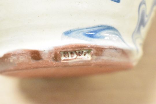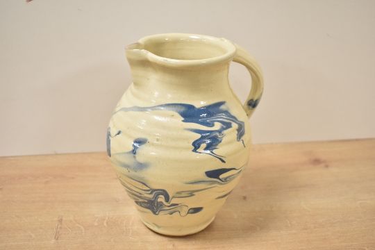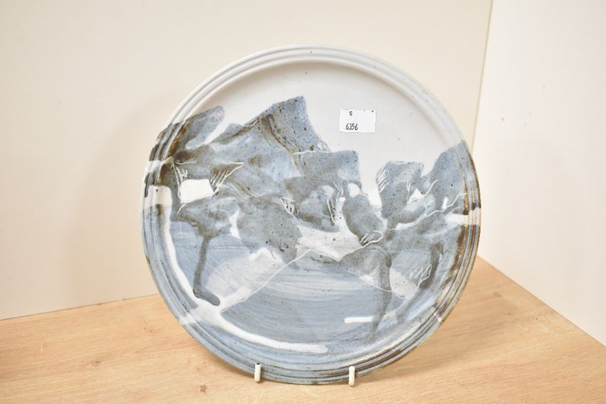 Two contemporary studio pottery pieces, to include a John O'Groats Pottery of Caithness charger, featuring an organically formed mountain range of hand applied slips; sold with a presumed Eden Pottery of Northern Ireland ewer, featuring a cream under glaze and abstract wave-formed decoration, both marked to base, (2), condition is consistent with age and use.
