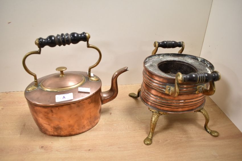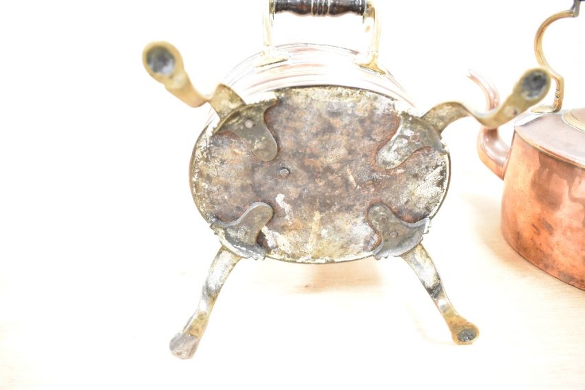A Victorian copper and brass spirit kettle with stand and burner, featuring turned ebonised wooden handles, unmarked, approximately 36cm, condition is consistent with age and use, visible areas of wear to metal.