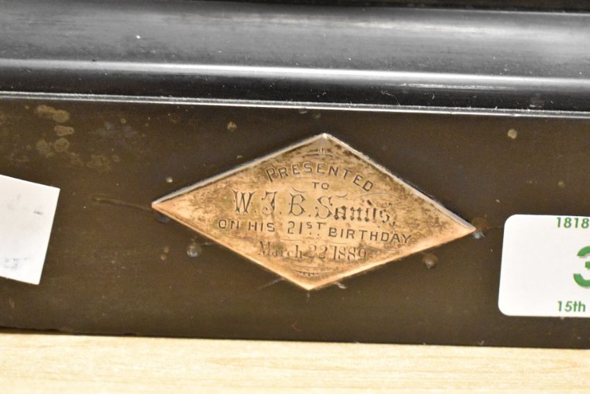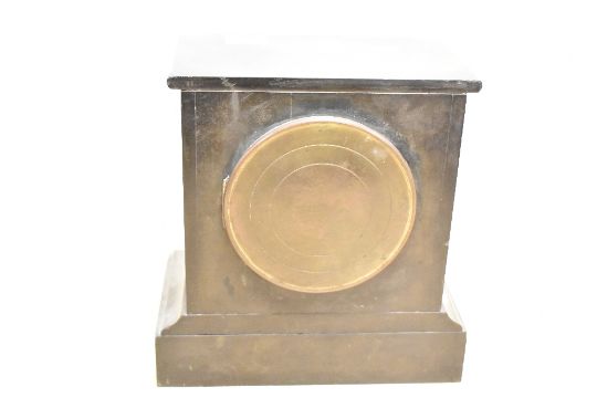 A Victorian black slate and marble mantel clock, of architectural style, having twin columns upon a stepped base, with Roman hours and a presumed French 8-day movement, having an inscribed plaque reading ‘Presented to W.J.B Sands on his 21st Birthday, March 22 1889’, unmarked to the clock face but inscribed ‘537’ to the base, 21cm, condition consistent with age and use, with some areas of visible wear to the slate and marble, and metal wear to the brass bezel and plaque. With key.