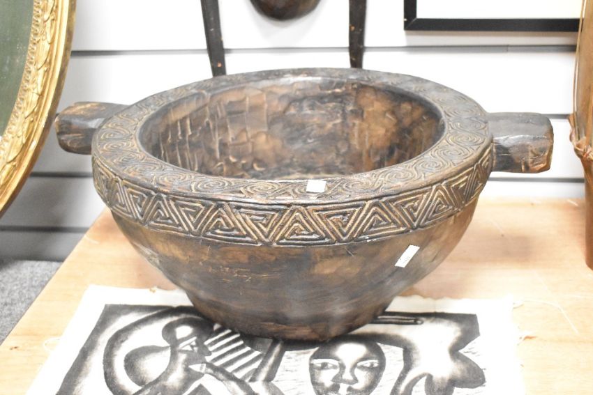 A small selection of presumed 20th-century African Tribal Art, to feature a large dark hardwood African tribal mask, featuring geometric patterns, scarification marks and facial features typical of West or Central African artistry; a large dark hardwood bowl, again featuring geometric patterns around the rim with two large handles; and a black and white fabric painting of stylised figures playing musical instruments, illegible marking to right bottom corner, (3), condition is consistent with age and use, visible areas of surface wear to both wooden items and the fabric has natural frayed edges.