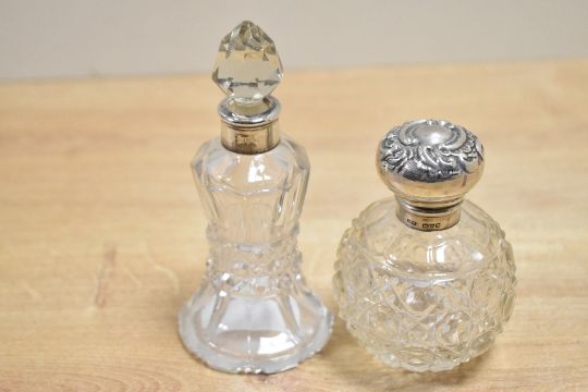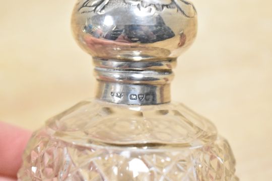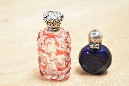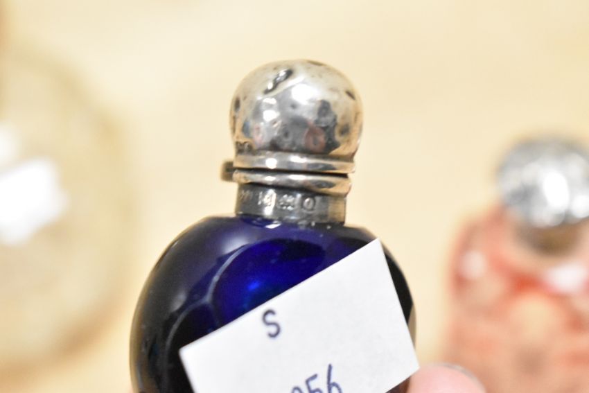 A quantity of late 19th to early 20th-century Silver and glass perfume bottles, to include a small blue glass example marked for Birmingham, C.C. May & Sons, 1913, featuring a miniature internal stopper; a tall cut glass example with a faceted stopper and silver neck marked Chester, 1913, the maker?s mark illegible due to fading; a hobnail cut glass example with an ornate silver top marked Chester, J. & R. Griffin, 1909; sold together with a small cut-through cranberry glass and white metal mounted example, unmarked, (4 in total), condition consistent with age and use, with no visible areas of chips, cracks, or evident damage.
