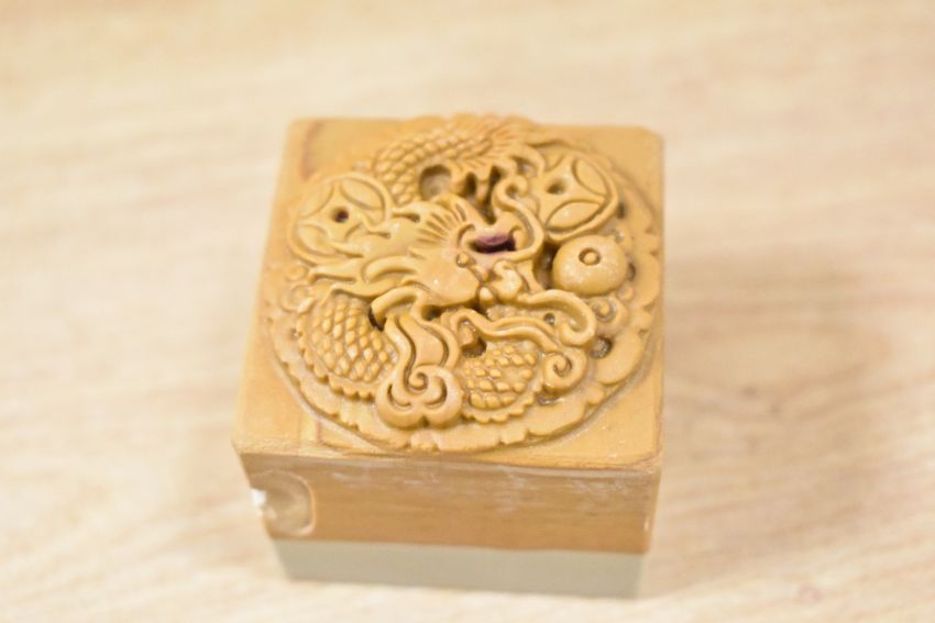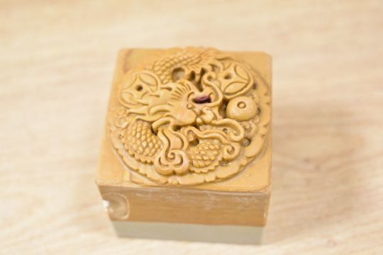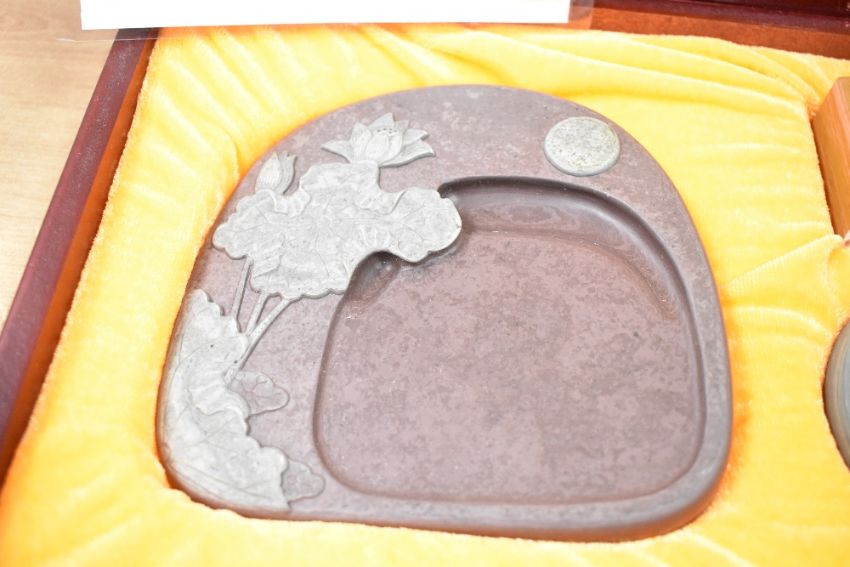 A modern Chinese Qingqu inkstone, carved from Songhua stone and sold along with a water bowl and seal/weight, housed in a fitted and lined case with Chinese Arts and Crafts Association certificate