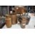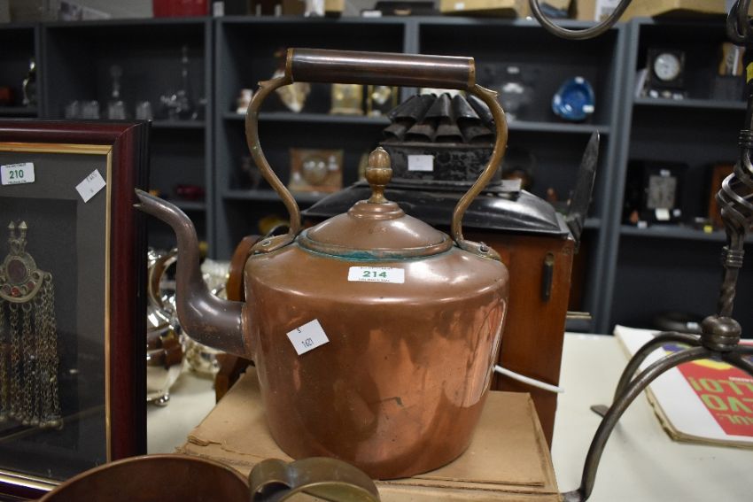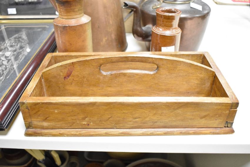 A selection of late 19th to 20th-century sundry housewares, to feature two copper stove top kettles, having delicate acorn-formed finials; a copper hot tea kettle; two stone jars and a wooden cutlery box, some marked but not all, (6 pieces), condition is consistent with age and use, visible areas of surface wear to all and natural oxidisation to metalwares.