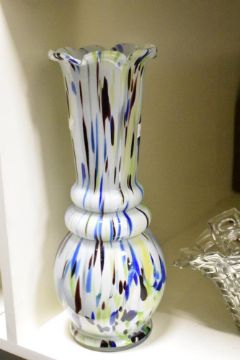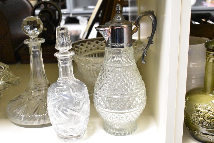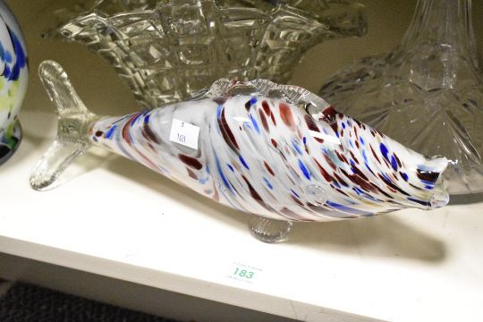 A quantity of 20th-century glassware, to include an Italian Murano-style art glass fish; a Murano-style glass vase featuring a colourful 'splatter' patter; an Italian Sheretonn silver-plated ewer and more, some marked or with sticker but not all, (7 pieces) condition is consistent with age and use.