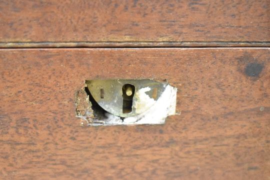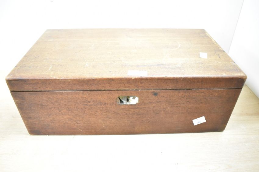 An early 20th-century mahogany writing slope, having interior compartments, soft green slope and a hidden side drawer, 25cm x 45cm, condition is consistent with age and use, slope itself is coming away from interior fittings, missing brass escutcheon to front. Key present.