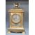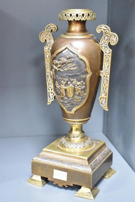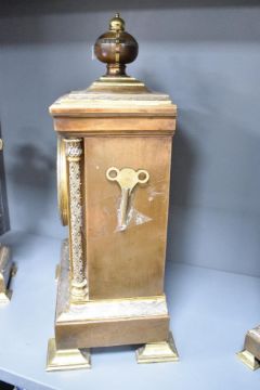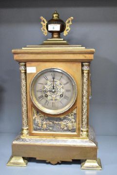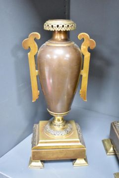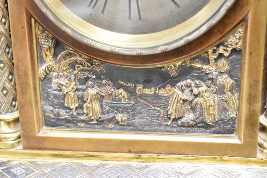 A presumed late 19th-century French gilt bronze and brass architectural 'Orientalist'-style mantel clock, featuring an urn-form finial, a graduated pediment descending to a case flanked by braided columns with acanthus leaf capitals, supporting a chapter ring with Roman numerals and an intricate arabesque filigree centre, below the dial a finely chased bas-relief panel depicting a romanticised desert scene with traditionally dressed figures amongst palm trees and a distant walled city, raised on a broad rectangular stepped base with geometric diamond-hatched decoration, upon four raised feet, likely with an eight-day French striking movement; sold with two matching mantel vases of ornate Middle Eastern-style decoration, clock marked 'A.B' to back plate with small patent markings to reverse of all pieces, clock is 46cm and vases 32cm, (3), condition is consistent with age and use, some visible wear to metal and surface wear to all pieces, clock has a key but is sold as seen.