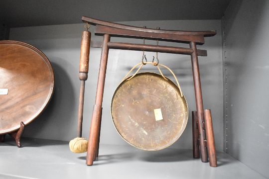 A presumed 20th-century brass dinner gong mounted upon a wooden tori gate-style tabletop stand, featuring inscribed foliate detailing to the gong itself with a wooden striker, 32cm tall, condition is consistent with age and use.