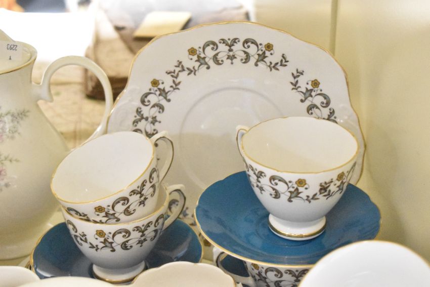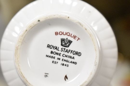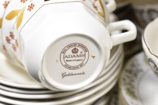 A large quantity of 20th-century tableware, to feature part sets of Royal Stafford bone china 'Bouqet'; Adams ironstone 'Goldenvale'; Royal Sutherland china; Enoch Wedgwood Tunstall Limited 'Asiatic Pheasants'; Elizabethan bone china and more, to include cups, saucers, milk jugs, a tea pot, a small serving platter and more, most marked to base, (approximately 112 pieces), condition is consistent with age and use, one milk jug is missing a handle, general signs of wear to all pieces.
