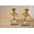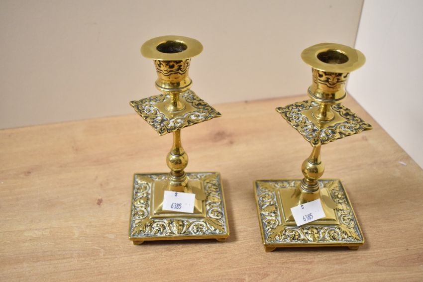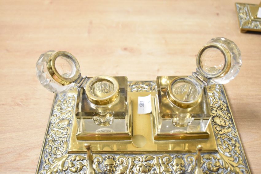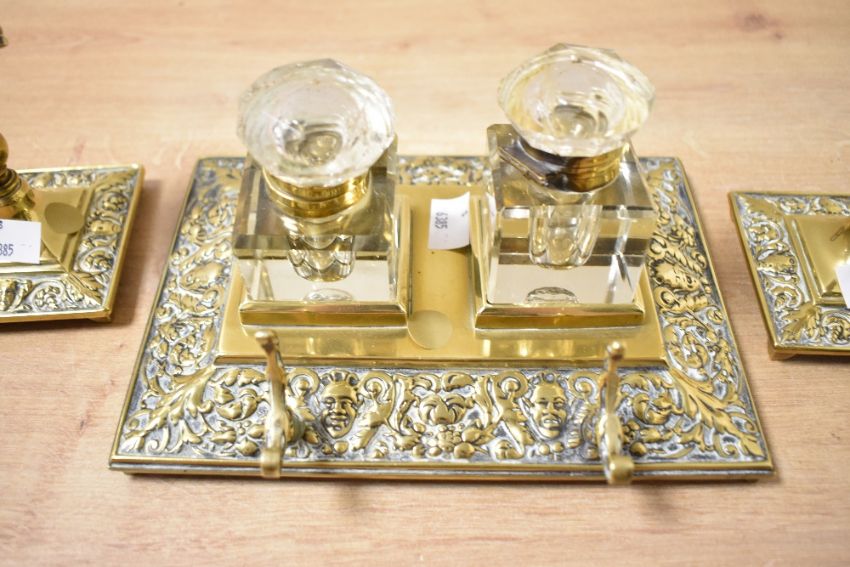 A Victorian brass double inkwell with matching candlesticks, featuring floral and foliate detailing interspersed by sweet Putti, the inkwell fitted with two cut crystal glass inkwells with brass mounts, all unmarked, (1 double inkwell, 2 glass inkwells and 2 candlesticks), condition consistent with age and use, one of the inkwell lids rather loose.